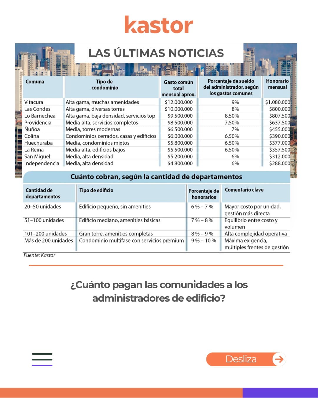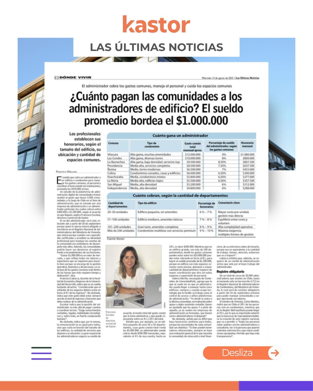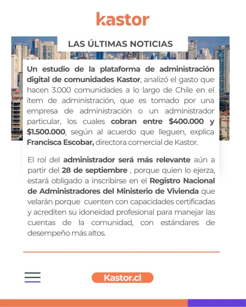 Un estudio elaborado por Kastor, plataforma líder en gestión digital de comunidades, analizó más de 3.000 edificios y condominios en todo Chile, revelando que el honorario promedio mensual pagado a los administradores es de $978.000.